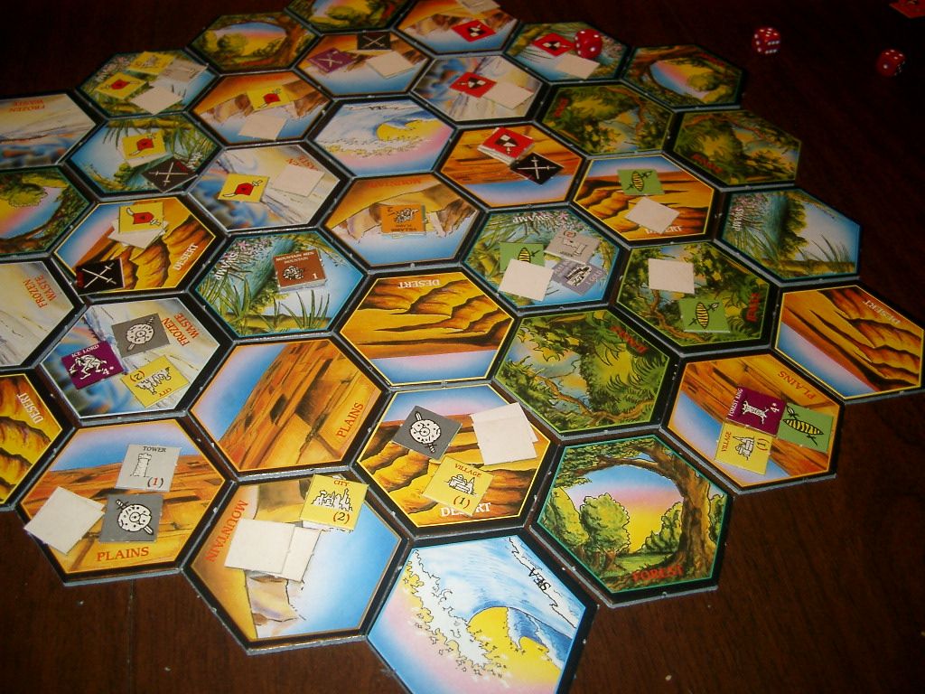 The game is basically played on a Settlers of Catan board. Separate hex tiles are placed, each with a different type of terrain: tundra, jungle, forest, plains, swamp, mountain, desert, and sea.