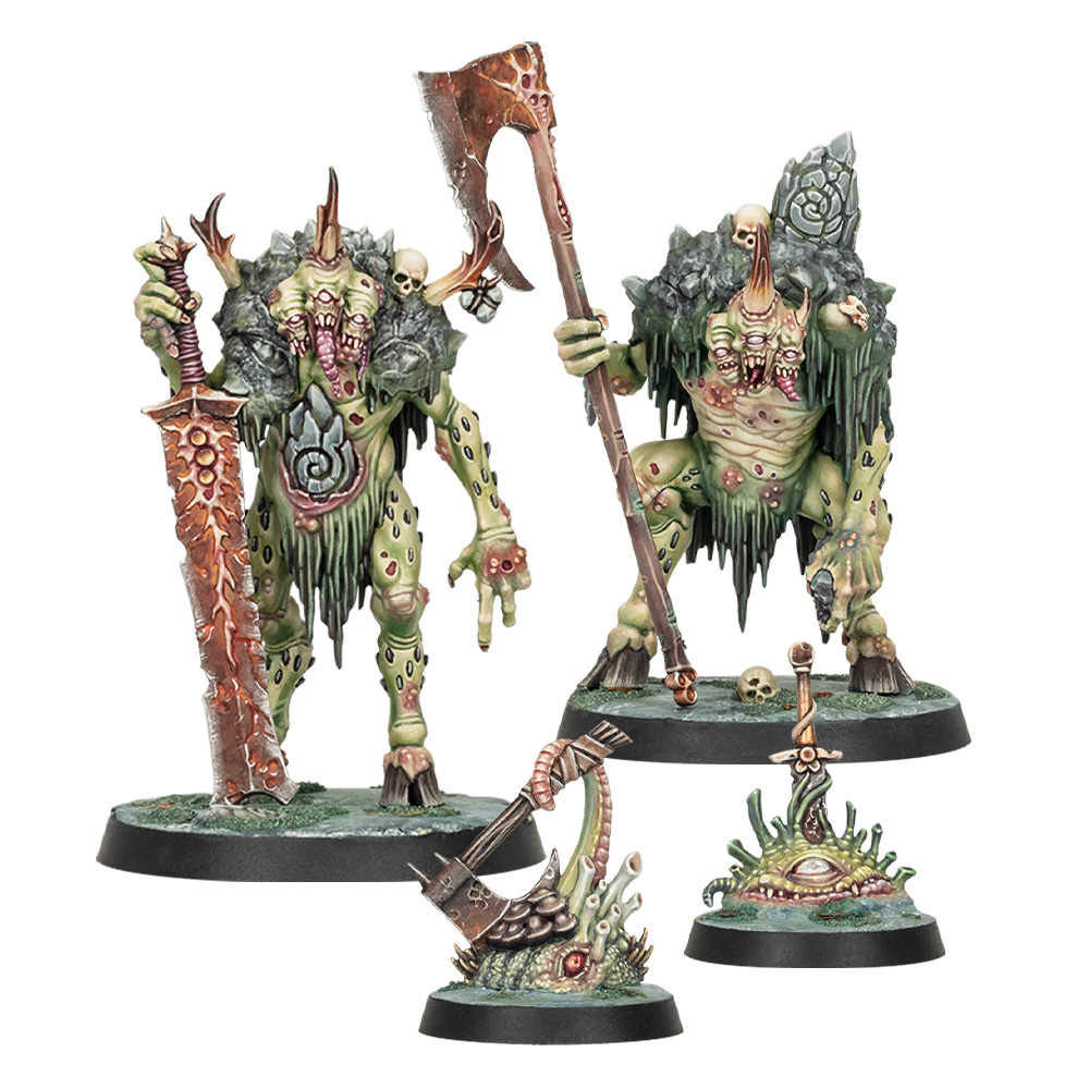 “A pair of ancient daemons once said to have been part of a group of seven, the Cankerborn are summoned from the Garden of Nurgle when an act of foul desecration is committed upon the land in Nurgle’s name. When the battlefield is polluted, either by Gelgus Pust or the Pestilent Pollutants that often manifest alongside them, they can flicker out of existence and reappear elsewhere in order to cut their foes down with colossal, seeping blightblades.