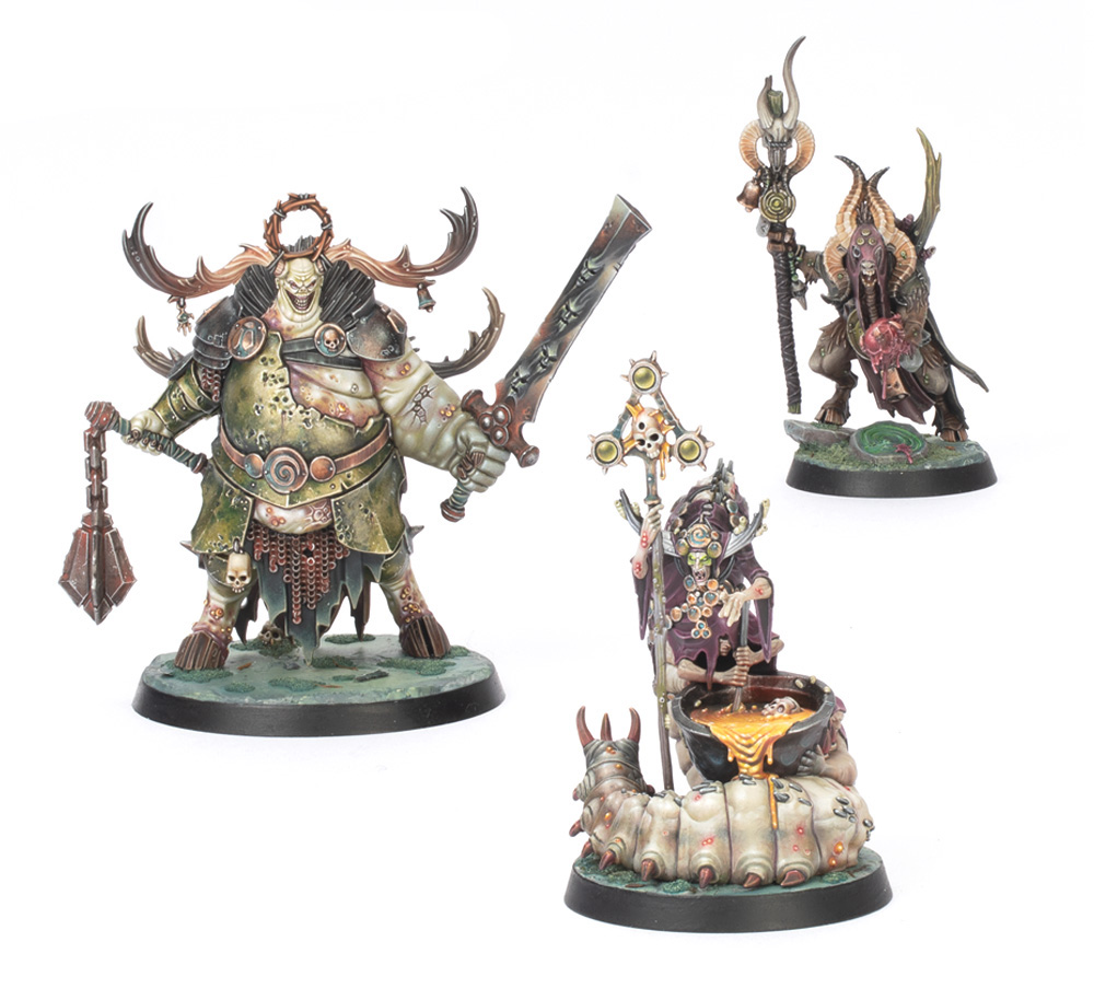 He is joined by Belga the Cystwitch, who causes diseased foes to suffer even more with each death summoning Plaguebearers, and Shaman Foulhoof, who enhances the combat prowess of Pestigors and uses his sorcery to weaken enemy weapons. All three are push-fit, single pose miniatures.”