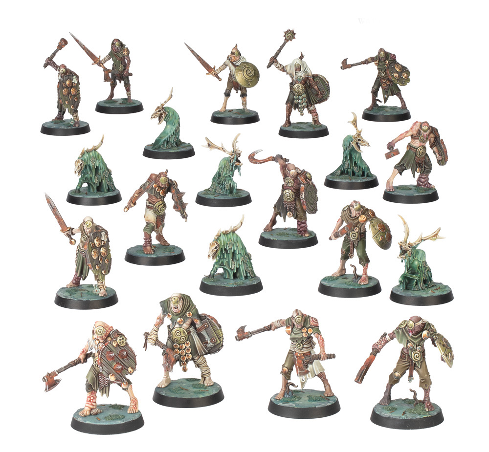 This plastic push-fit kit builds 14 Pox-Wretches and six Mire Kelpies. Each group of seven Pox-Wretches has two build options, so you can build a full set of 14 unique miniatures.”