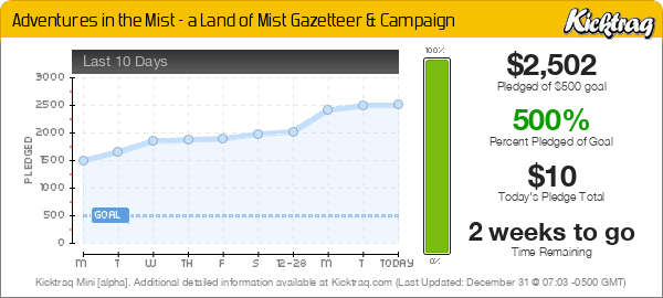 - MOST POPULAR PLEDGE: $30 + S/H for the PDF and print versions of Adventures in the Mist and Land of Mist for Old-School Essentials