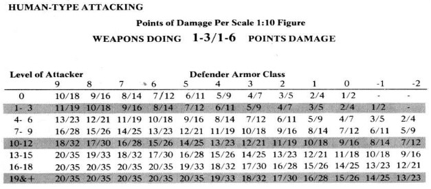 The attacker checks the table for their level and which weapons they are using and compares the AC of the defender and sees how much damage they do.