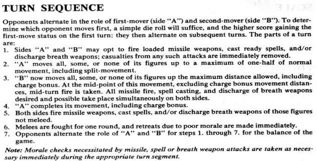 As stated before, Swords and Spells attempts to simplify the scale of war and it does a decent job of that. Still, there are a few clunky rules sprinkled throughout. Perhaps the best example of what I mean can be shown by looking at the turn order for the game.