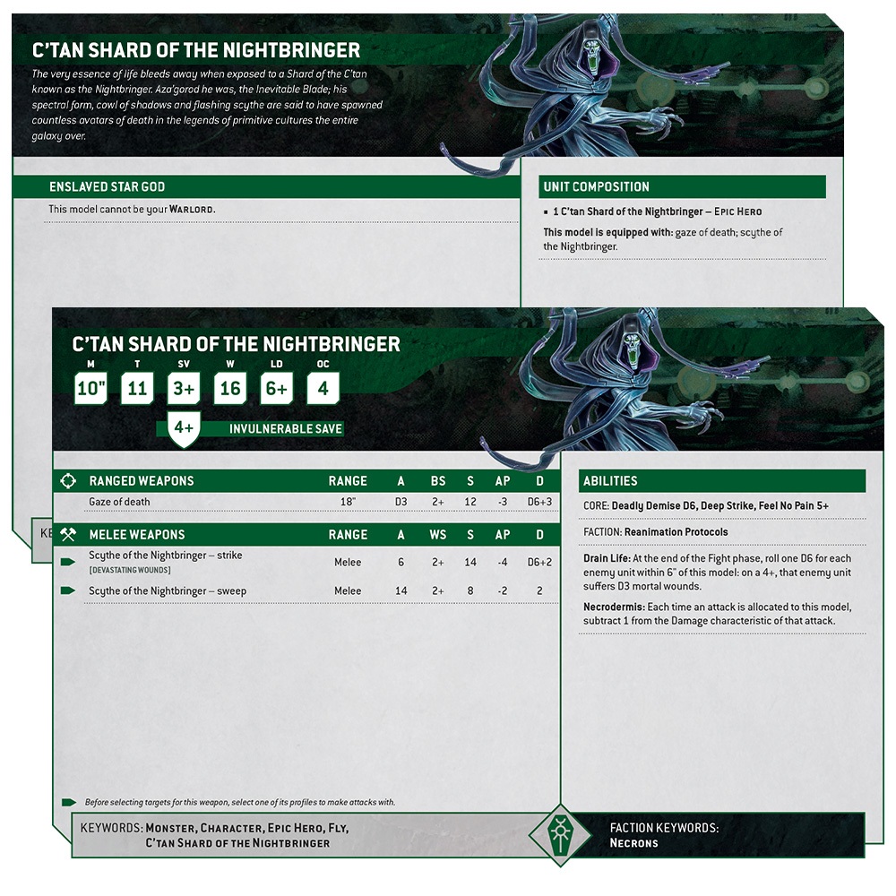 Kicking things off we’ve got to start with the Nightbringer’s new statline. You can see the boosted characteristics above. The Nightbringer is going to be flying across the tabletop with a fury. On top of that it’s going to be even harder to kill than before. I just want to point out the 16 wounds backed up by a 3+/4++ as well as a FNP of 5+, too. If you’re going to hit the Nightbringer you better bring your big damage guns with high AP. Necrodermis also reduces the damage of attacks by 1 as well.
