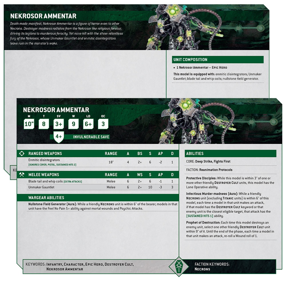 Also, Nekrosor Ammentar has some really good utility. With the Nullstone Field Generator it can help with mortal wounds and Psychic Attacks. It’s a 5+ FNP which is better than nothing against those attacks! It’s also got Infectious Murder-madness which gives friendly Necrons Sustained Hits 1 if they are Destroyer Cult or attacking the closest enemy. The Nekrosor also helps other Destroyer Cult members out with it’s Prophet of Destruction ability, too. This is re-roll of 1s for Wound Rolls which is always helpful!