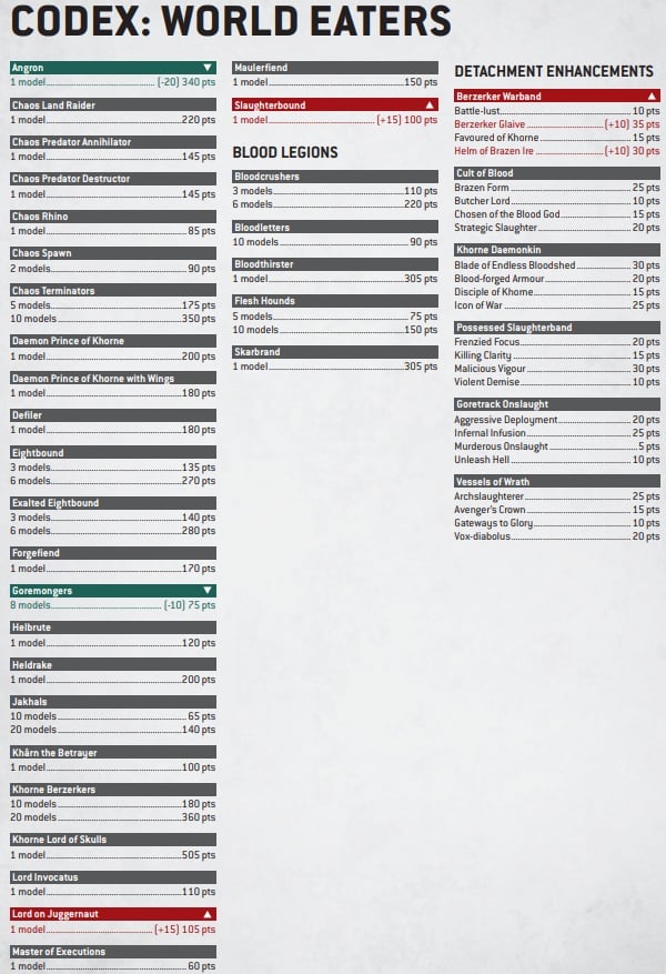 It’s also designed specifically to be used with the Khorne Daemonkin Detachment option for the World Eaters. All of that checks out. Still, the future state of Chaos Daemons is a little wobbly. That said, I’m still going to do some math and figure out what sort of deal we’re getting for this one.