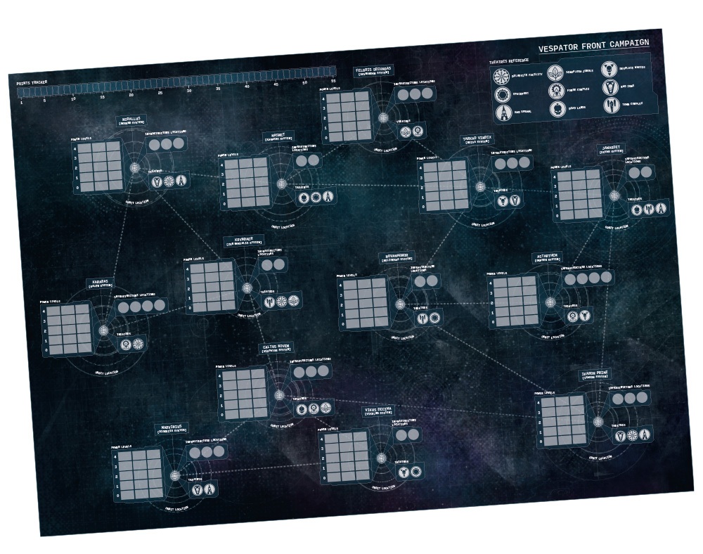 The 500 Worlds: Titus set comes with a large fold-out campaign map to get you started, which is the perfect rallying point for your players when hung on a wall or spread across a table. Here you’ll see all of the systems you’ll be fighting across in a typical Vespator Front campaign*, with all sorts of boxes to fill in with information as the story progresses.