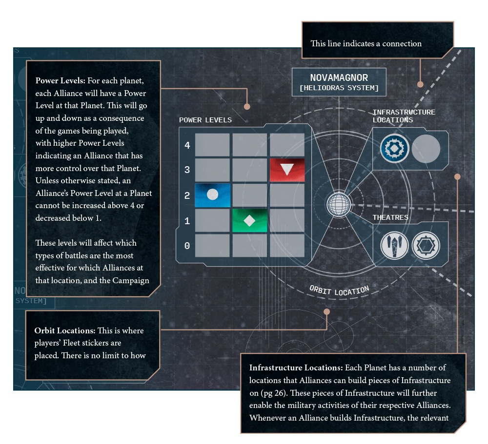 Each one of the zone is essentially it’s own system. Within that system you’ve got a few different things to help keep track. You can see the breakdown above. What I like about this is how each of the systems has their own Theatres to battle in. These can impact your games and also help shape the developing narrative. There’s also important Infrastructure Locations, too. These can help support your war campaigns as you move from planet to planet!