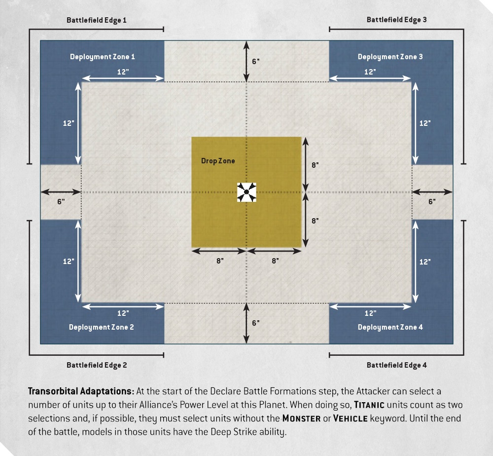 One example that was provided was the Orbital Invasion. This represents an army coming down from Orbit via Drop Pods or other means. You can see the deployment zones below.
