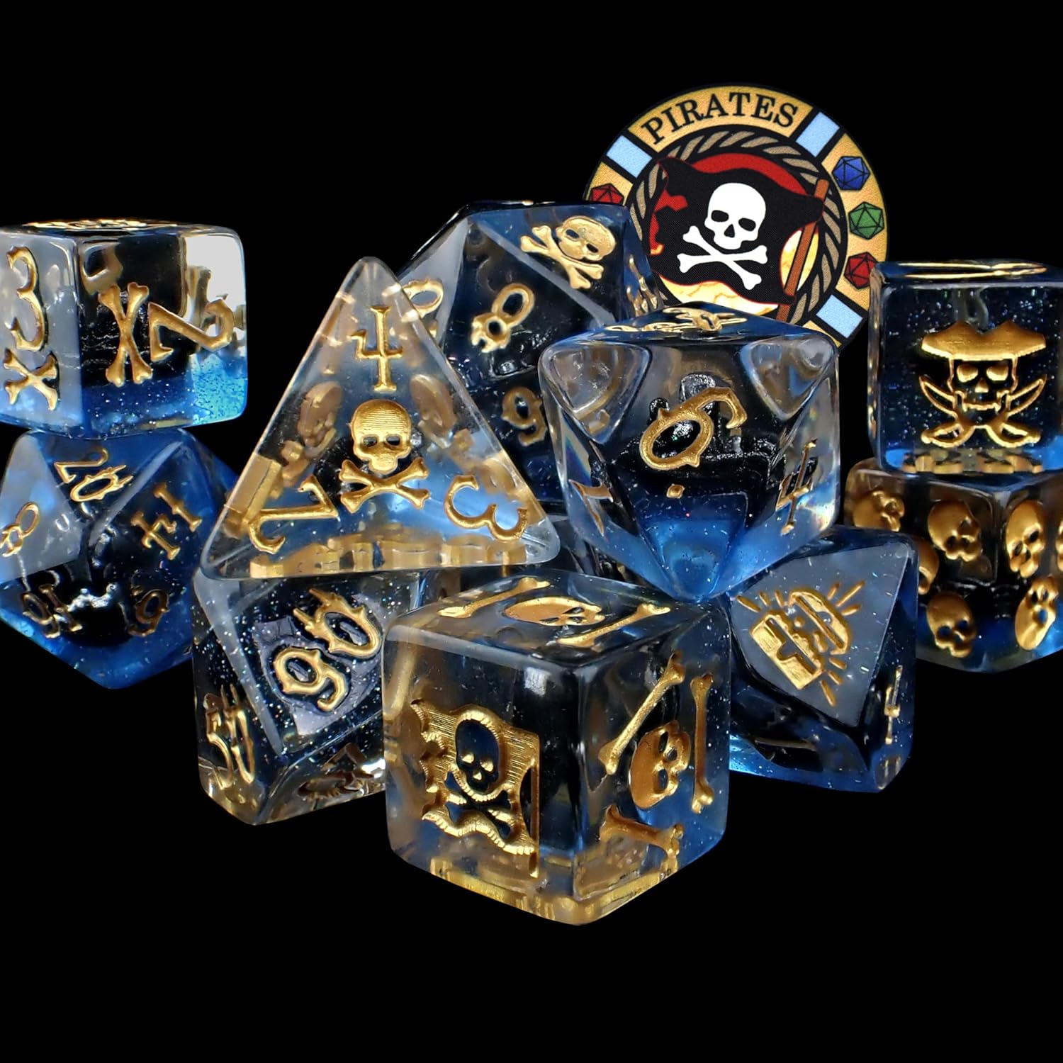 When we think of pirate imagery, few things are as prevalent or consistent as a good old-fashioned skull and crossbones. Followed pretty closely by treasure. And these dice have it all. A piratey skull on some very shiny coins and jewels is one of the most pirate thing I can think of. And the blue resin surrounding it all makes this treasure look especially waterlogged and treacherous.