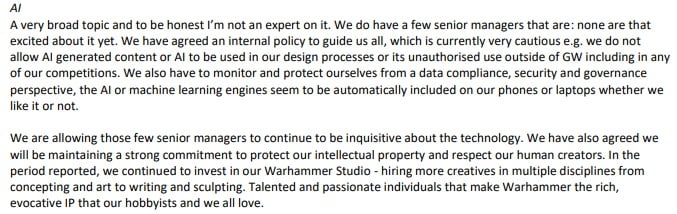 Games Workshop has taken a position on AI generated content: “we do not allow AI generated content or AI to be used in our design process…”