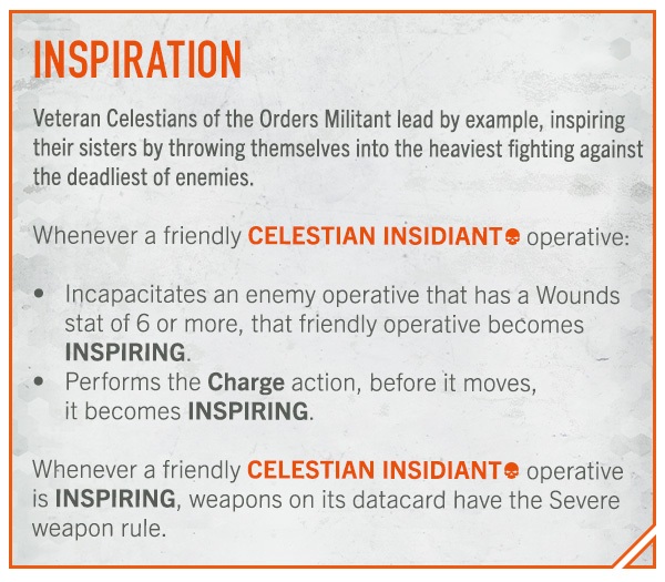 So right off the bat we’ve got Inspiration. This rule really kicks in after one of the Celestians takes out an enemy with a wounds stat of 6 or more. This applies the Severe rule to their weapons after charging. But that’s just the first part of this combo machine.