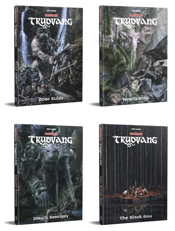 The campaign itself will see four books through to publishing. You’ll get the World Book, a deep dive into Trudvang’s history, peoples, and regions. A book of Core Rules that serves as the player’s guide, with new Trudvang specific professions, heroic abilities, and magic. Jorgi’s Bestiary is a manual full of Trudvang monsters, including the braskelwurm, draugr, hrimtursir, and yggdras, all adapted for Dragonbane‘s rules. And The Black Sun—a four-part epic campaign that captures Trudvang’s spirit.