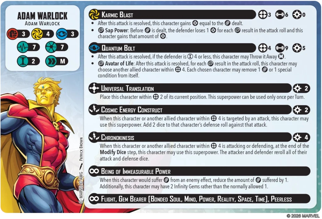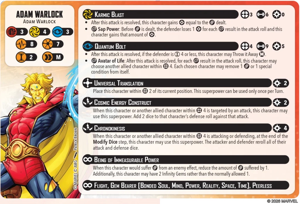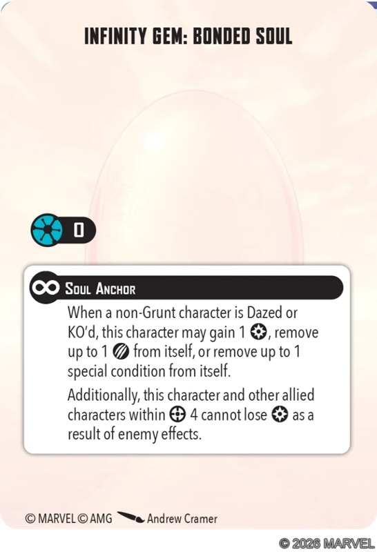 This is a special Bonded Soul Gem specific to Adam Warlock. Note that it’s basically free for him to take as well. That’s important and it’s also why he’s a Threat 7 base. Keep in mind that Infinity Gems also grand the wielder an extra power in the power phase which will help with the rest of his (somewhat) expensive kit. On top of that, it’s got a nice effect as it prevents allies from losing energy due to enemy effects and it also allows Adam to Heal when a non-Grunt is Dazed or KO’d. That’s pretty handy. Suddenly that 7/8 stamina total isn’t seeming so bad.