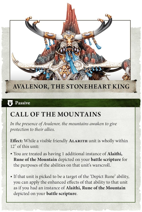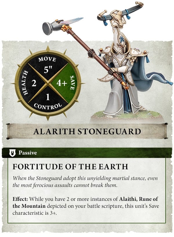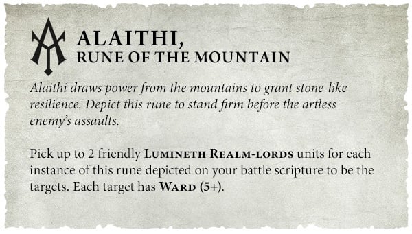 If you have TWO instances of Alaithi, Rune of the Mountain, this unit gets their armor boosted to a 3+ save. Note that this unit doesn’t have to be the target…they just get a passive boost. And they aren’t the only unit like this.