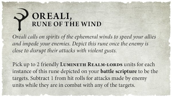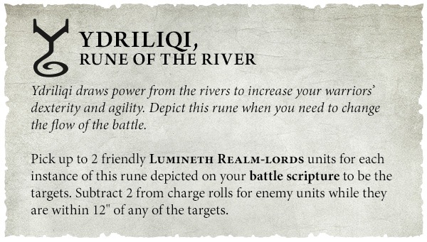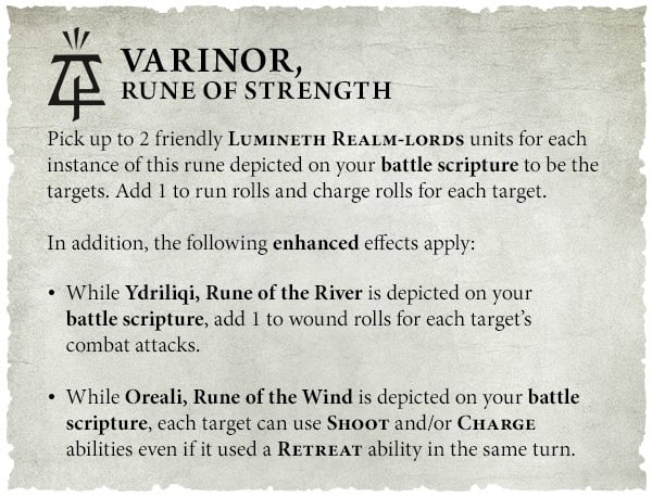 A master of the runes of Hysh is able to scribe the correct runes to address the situation at hand. At the beginning of each battle round, you will select one of five runes to depict on your battle scripture. These runes will impart immediate power to up to two friendly units on the battlefield. As the battle progresses, you may depict the same rune multiple times to increase its power, enabling you to pick even more units to benefit from its effect.