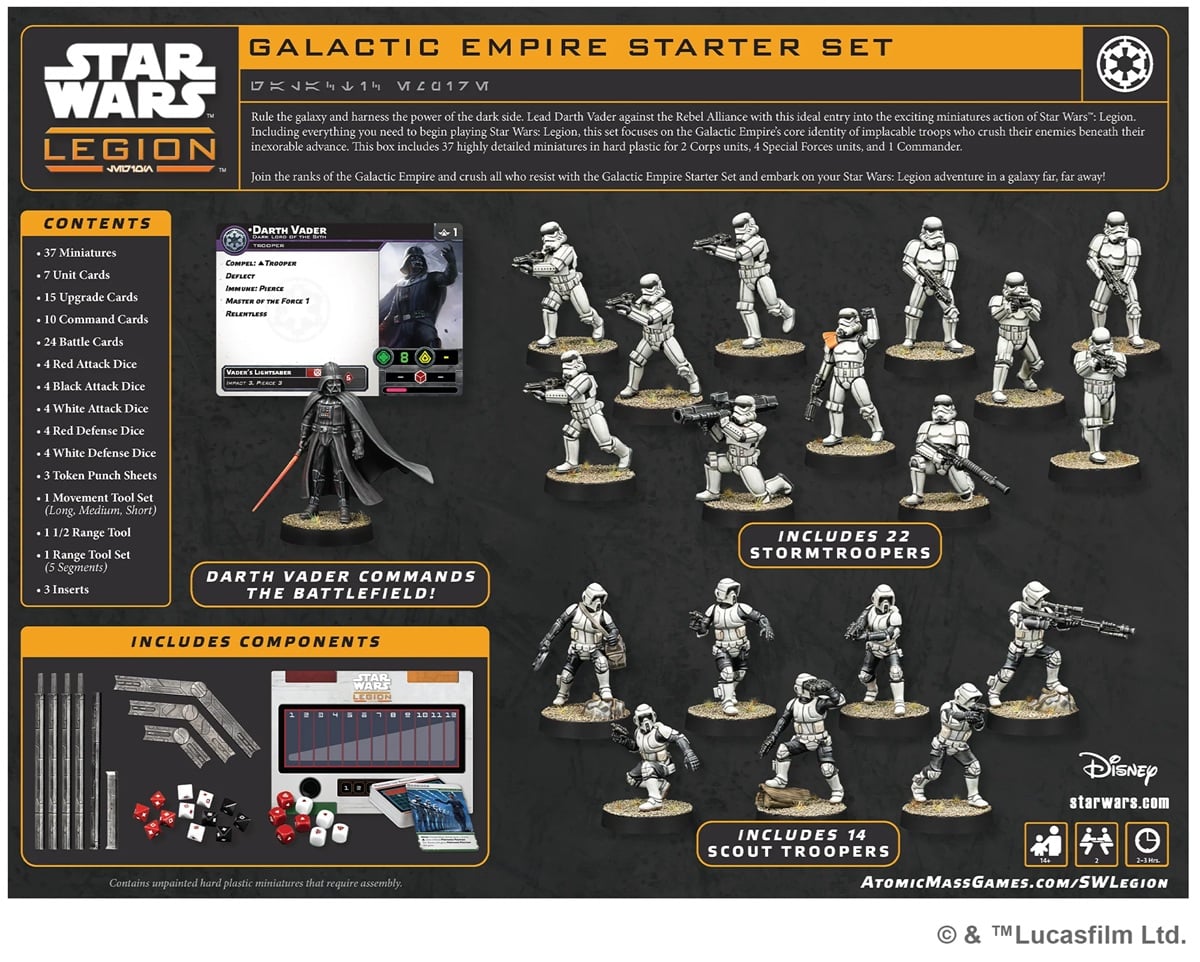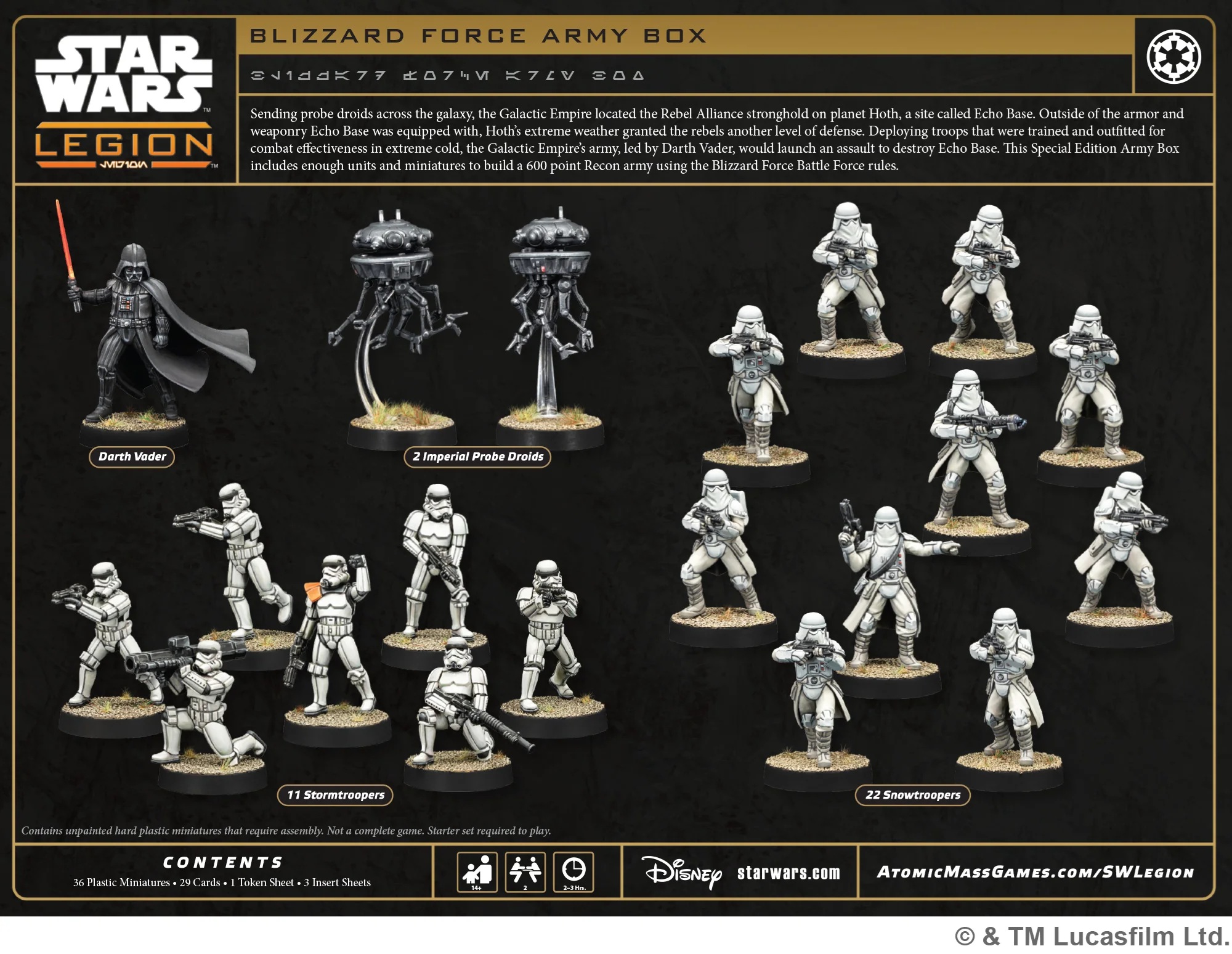 This Blizzard Force Special Edition Starter Set contains a 600-point Recon-level army, including a Special Edition alternate sculpt of Darth Vader. It also includes all the dice, templates, tools, and tokens a player needs to begin playing their first games of Star WarsTM: Legion.