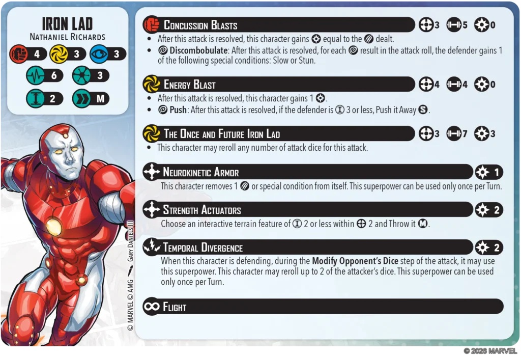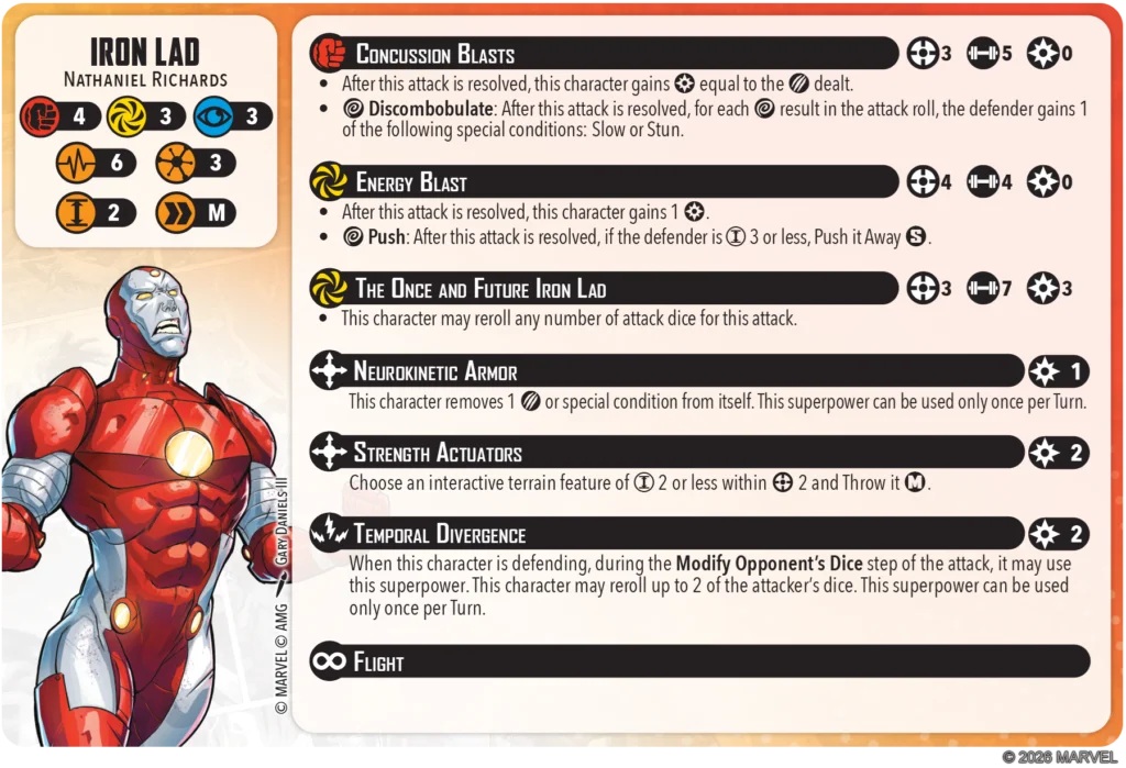 His injured side is the same stat-wise. For Superpowers he’s got Neurokinetic Armor which costs 1 power to activate. It allows Iron Lad to remove 1 damage or special condition once per turn. He’s also got Strength Actuators for 2 power. This one gives him a medium throw for terrain size 2 or less within range 2. After the terrain throw reworks, this isn’t too bad to have in your back pocket! Finally, we have Temporal Divergence which also costs 2 power. This one allows for Iron Lad to force the attacker to reroll up to 2 of their attack dice. That’s an interesting way to prevent damage/wilds from triggering.