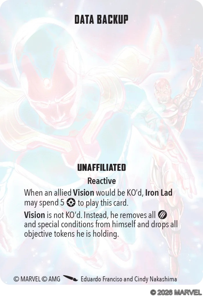 The final preview is for Data Backup. This one directly interacts with Iron Lad and Vision. It allows Iron Lad to essentially spend 5 power to prevent Vision from getting KO’d. It’s a full reset for the android which is kind of huge! Now I’m really wanting to run Iron Lad with the Avengers. It could be a fun way to mix things up.