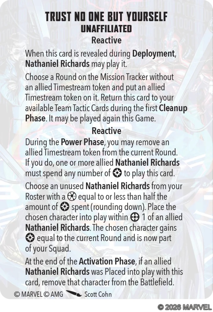 This one is pretty weird but it plays into the whole “Kang Dynasty/Council of Kang” thing he does in the comics. It’s where he recruits a bunch of versions of himself from different points in time and…you know what, let’s just chalk this up to “Because Comics!” ANYHOW, this Team Tactic Card basically allows you bring in another character that also happens to be Nathaniel Richards. Now, that character you brought in does go away at the end of the Activation Phase, but they basically get a whole turn.