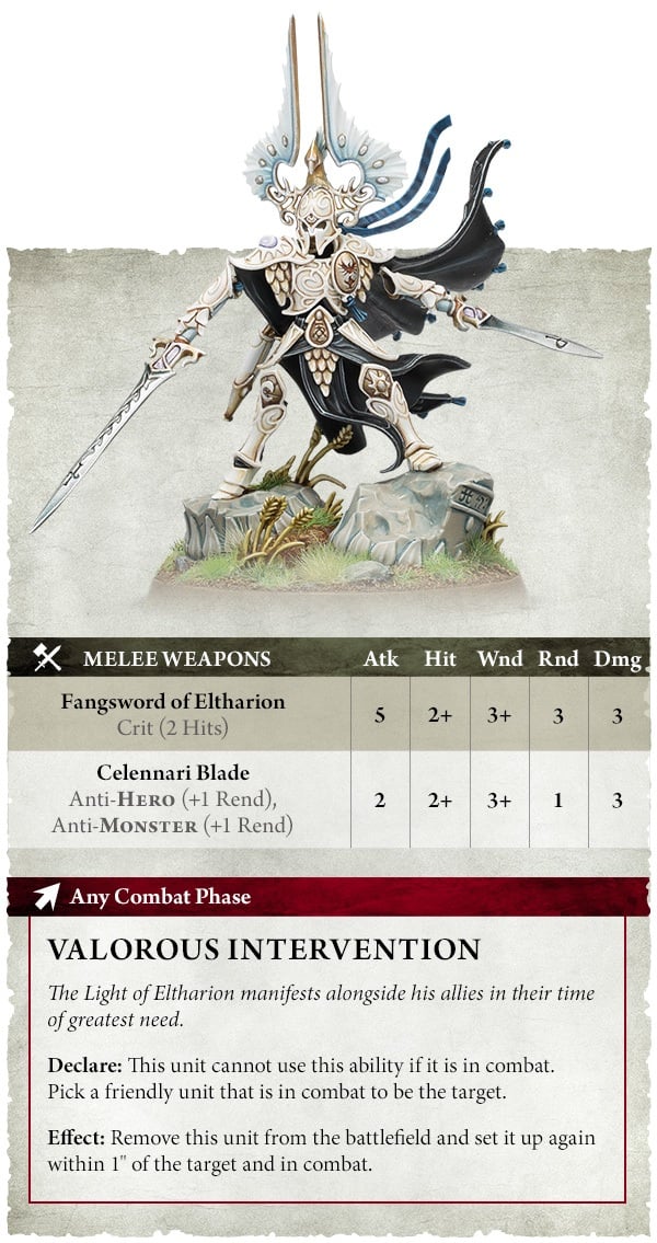The Light of Eltharion traded in his ethereal save and recursion abilities for a 3+ save and a 4+ ward. He’s also got the “shoot in combat” rule as well as juiced up weapons stats now, too. That Valorous Intervention rule also looks potent for getting around.