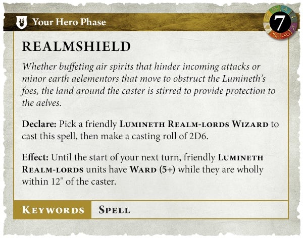 First up, we have the reworked version of Protection of Hysh. This is now dubbed Realmshield. It’s a 12″ bubble from the caster that gives units a 5+ ward. This should help to cut down on the need to spam the Rune of the Mountain.