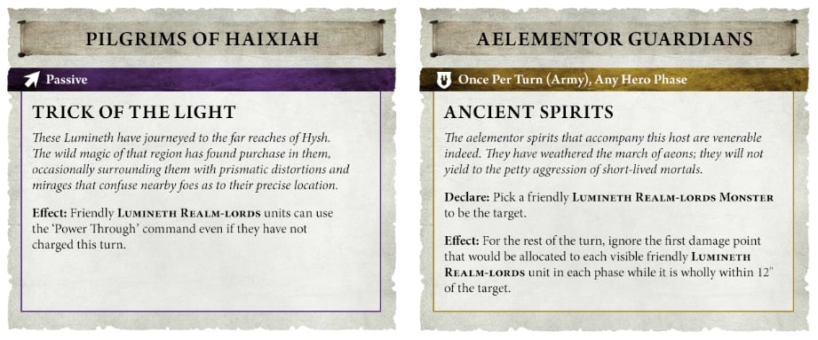 Here we have a look at some of the new Battle Traits. Trick of Light is from the Pilgrims of Haixiah and it let’s the LRL units use the Power Through command even if they haven’t charged this turn. Then there’s the Ancient Spirits from the Aelementor Guardians. This on reduces damage for units that are wholly within 12″ of an LRL Monster. It’s once per turn but it’s a nice damage reduction ability.