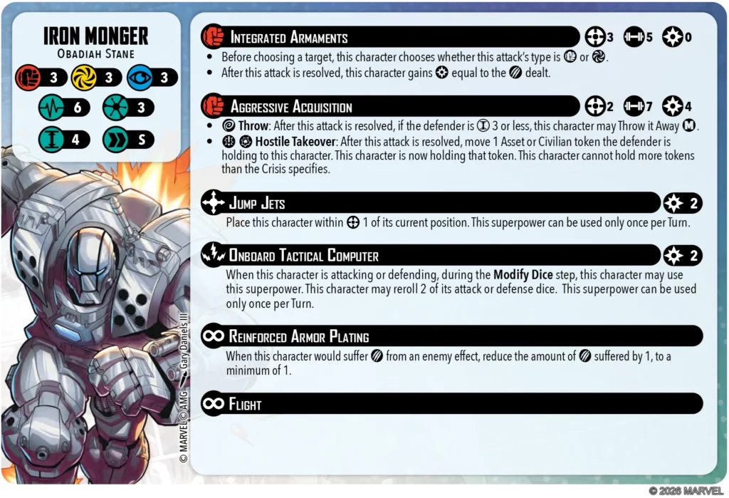 Attack-wise he’s got a builder with his Integrated Armaments. It’s a range 3 attack for 5 dice. What’s interesting is you can choose between physical or energy on this one, too. That’s a nice touch. It’s not flashy but it can be effective. His spender attack is Aggressive Acquisition. This one is a physical attack at range 2 for 7 dice. It cost 4 power but on a wild you can throw the target away medium (if they are size 3 or less). Additionally, if you get a hit and a crit, you also trigger Hostile Takeover. This is a sneaky way to snatch an Asset or Civilian token to Iron Monger’s control.