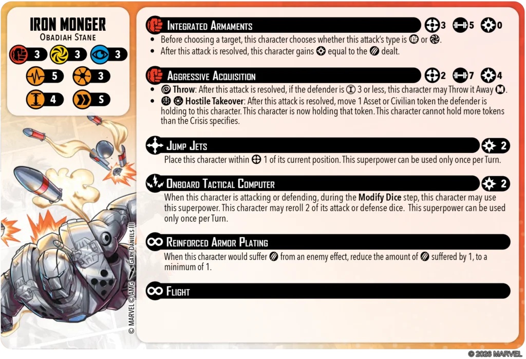 Iron Monger is joining the game as a large, size 4 model on a 65mm base! While that might not seem like a crazy thing, he’s the first Threat 3 character of that size. Which has some neat implications when you look at the rest of his kit. Defensively, he’s 3/3/3 with 6/5 Stamina. He’s “only” got a short move but if you’ve played any games with a 65mm base miniature then you know that’s PLENTY of movement. He’s got flight, too so getting around won’t be a problem. Couple that with his 2 cost Jump Jet power (which is a range 1 place ability for himself) and he’s going to be just fine in the movement department.
