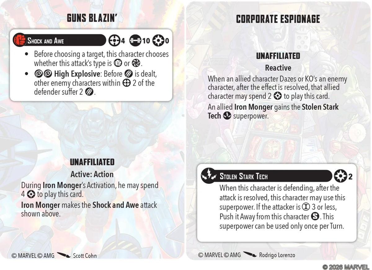 You can see both cards above and while a big 10 dice attack for 4 energy is nice, I think the Corporate Espionage card might be more useful. This one can allow Iron Monger to force the enemy to waste actions by displacing them after attacks. I could very easily see him stealing an objective and when they try to get it back he can simply push them away after the attack. Keep a look out for Iron Monger. He’s going to be a go to for a lot of lists in the future!