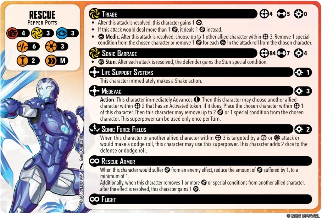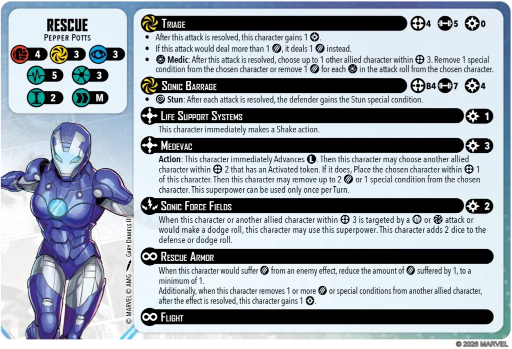 Pepper Potts, aka Rescue is here with her very own armor! Also a Threat 3 she fills a very different role on the tabletop and that’s as a great support character. Defensively she’s got 4/3/3 and 5/6 stamina. She moves medium and is size 2 as well. With flight she’s going to be able to easily traverse the board. That said, she’s got a great toolkit for helping your team out so let’s cover those attacks first.