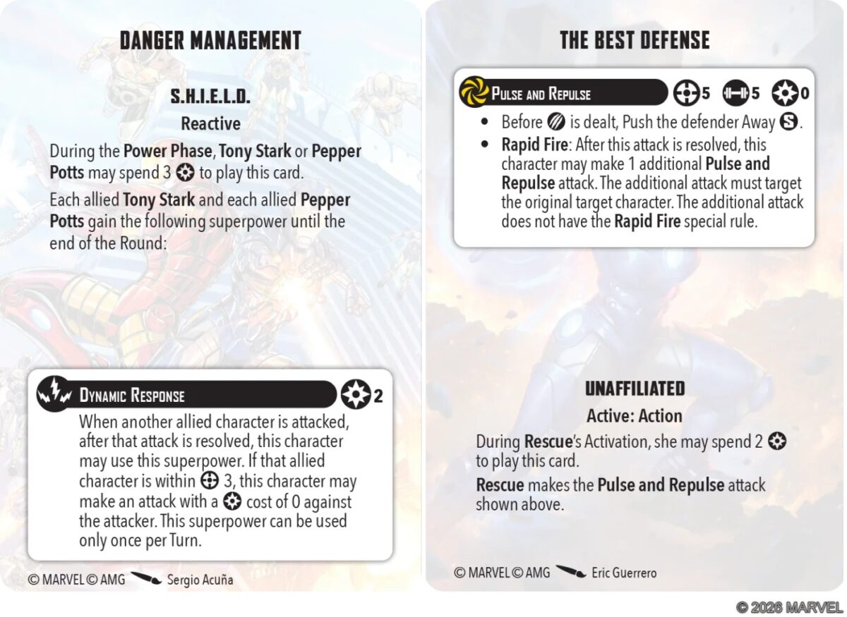 Danger Management works on her or on Tony Stark and it gives them both the Dynamic Response rule. For 2 energy, it allows them to make a cost 0 attack out of sequence. Not too shabby. Following that up she’s also got The Best Defense card which is another energy attack at range 5 for 5 dice. What’s interesting about this attack is that it pushes the target away Short. Additionally, it goes off AGAIN on the same target. If I’m reading this right, you’re basically getting to shove the target short twice! That’s great for moving folks out of position.