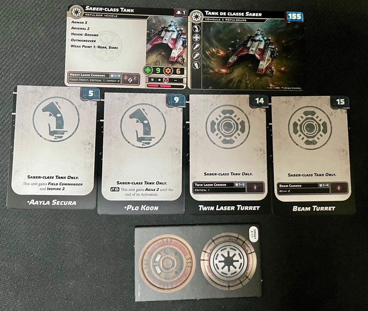 You can see the cards above. The TX-130 clocks in at 155 points base so it’s a chunk of points. You’ve also got various upgrades and options with a couple of different unique characters you can have in the tank. You can read more about the specifics of the tank here if you’re interested. I like the fact that you can upgrade the weapons to really take advantage of that Arsenal 2. That could be one of the turret options or Ordnance cards. That’s also reflected in the build options.
