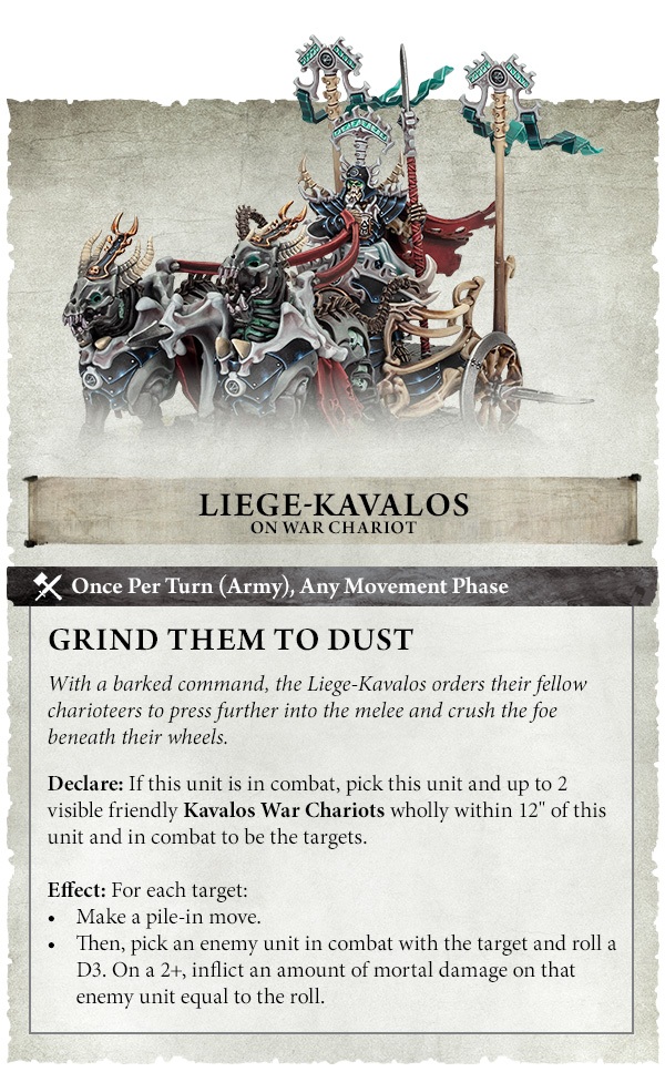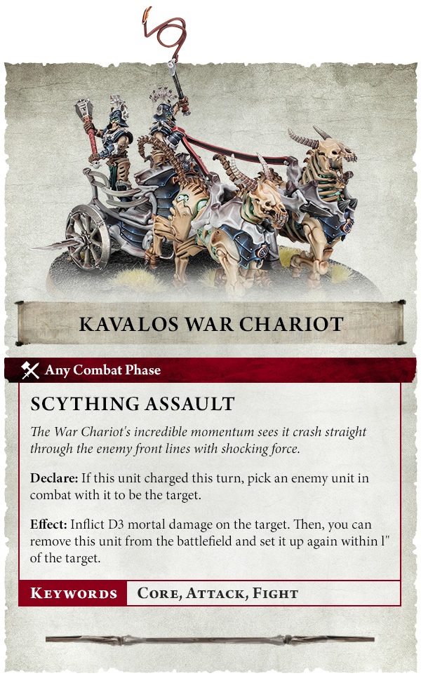 Each Liege-Kavalos on War Chariot is a Masterful Charioteer, able to undertake swift defensive manoeuvres that make them even harder to hit, granting them Ward (5+). By following their command, up to two nearby Kavalos War Chariots are also granted the ward, so three-pronged assaults are common.