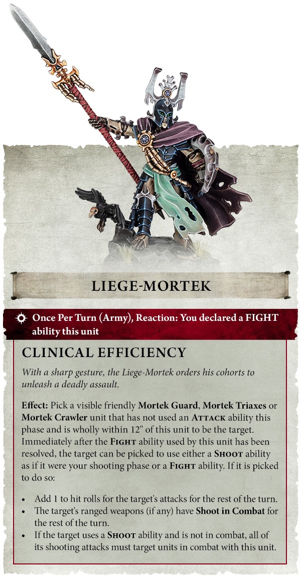 Finally for reveals we have the new on-foot version of a Liege-Mortek. They are the lower ranking officers of the Mortek but that doesn’t mean you should underestimate them. They have a brutal and Clinical Efficiency about them. This allows them to order another Mortek unit to fight immediately after them and it grants them +1 to hit. Additionally, you can also opt to have them order a unit to shoot instead . And yes, that means they can fire into combat!