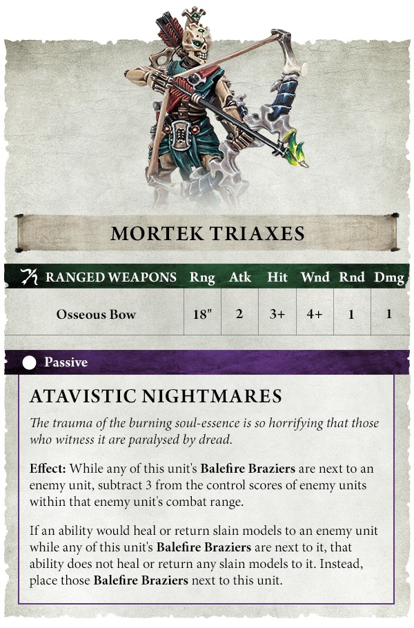Their Osseous Bows aren’t bad! You can see the stats of them above but what really makes this unit a problem are their Balefire Braziers. These are effectively markers for the unit. They act as a visual reminder that the target enemy unit has been debuffed in terms of their control score and also marked with an inability to heal or return slain models to their unit. I really can’t wait to get a unit or two of these guys on the battlefield. I think they are going to be a great addition to the Ossarich Bonereaper arsenal!