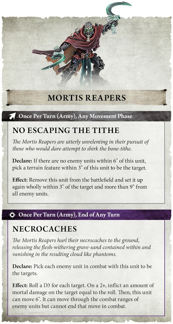 Another new unit are the Mortis Reapers. These assassins have movement tricks thanks to their No Escaping the Tithe ability which allows them to reposition very quickly. But that’s not the only trick they have to scurry around.