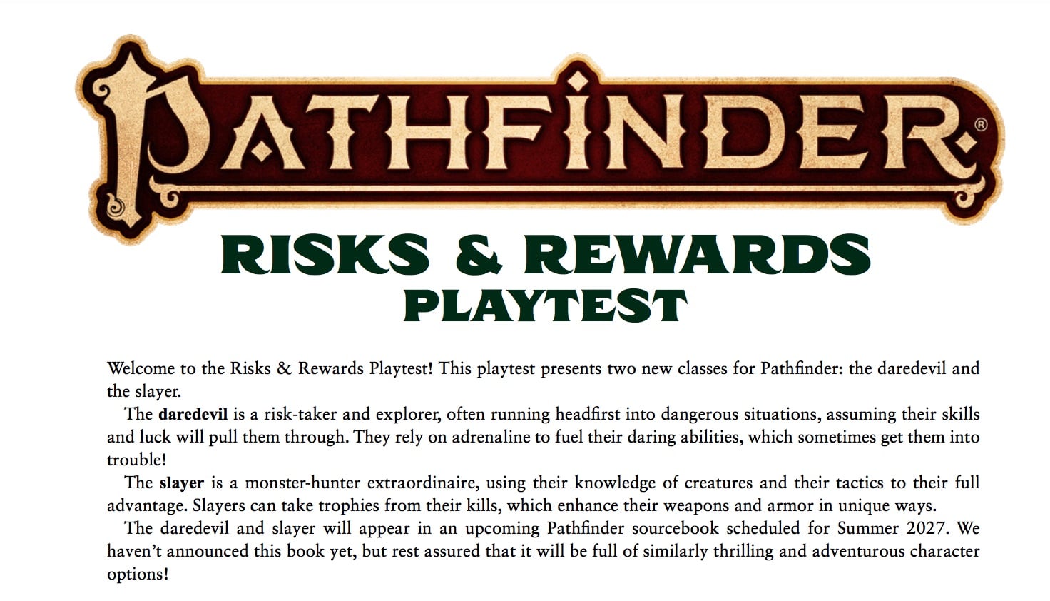 The Daredevil and the Slayer debuted last Friday during the Paizo Live stream. But the official playtest is open as of today. It runs through April 10th, which is plenty of time to put these classes through the paces.