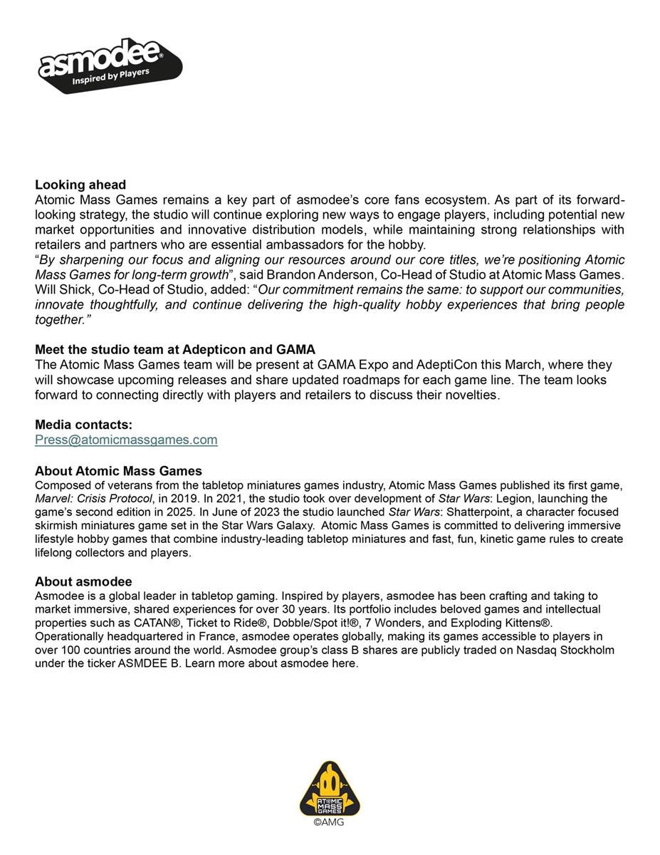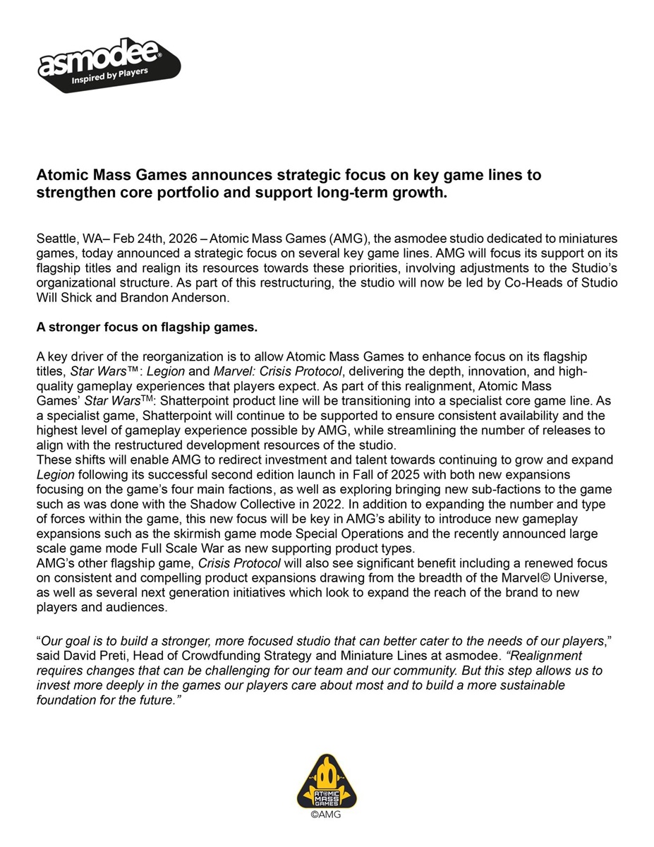 So basically Star Wars™: Legion and Marvel: Crisis Protocol are going to get more attention and support while Star Wars™: Shatterpoint will be scaled back to a specialist game. It’s still going to be supported “ensure consistent availability and the highest level of gameplay experience possible by AMG, while streamlining the number of releases… ” you can draw your own conclusions from that line.