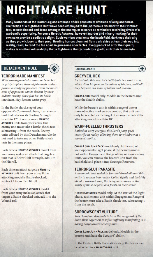 I like this one because the Combat Patrol bleeds into this Detachment well. There’s obviously a lot of Heretic Astartes to tap for various abilities and stratagems. But in particular, the Chaos Lord with a Jump Pack and Warp Talons are key features here. I’d say point out a list with this Detachment in mind and see if it works for you!