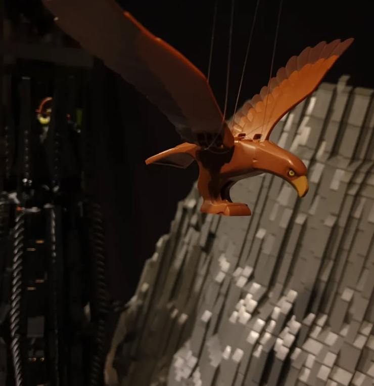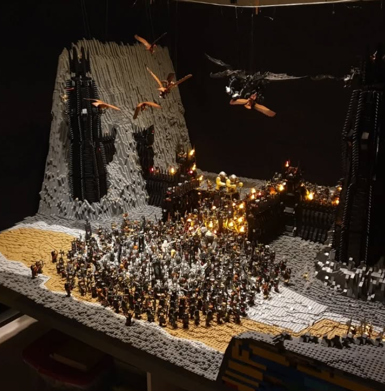 Across from the Black Gate, you can also see the hill that Sam and Frodo spied on the gate from. This build has not just some great castle/fort working on it, but it also has a lot of cool mountain work. In the plane in front of the gate, we also have the Battle of the Black Gate depicted with hundreds of minifigs, showing off the desperate attempt to distract Sauron. Finally, above that, we have an epic battle between Nazgul and Eagles.