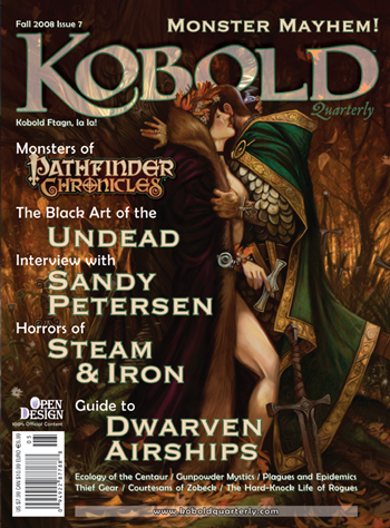 The patronage/crowdfunding approach had funded Steam & Brass, a D&D 3.5 adventure in the Free City of Zobeck in 2007, which was only sent to its backers. Then Kobold Ecologies took the ecologies articles from Kobold Quarterly (and several new ones!), creating an expanded softcover book with about a dozen ecologies. Freelance editor Scott Gable made it shine.
