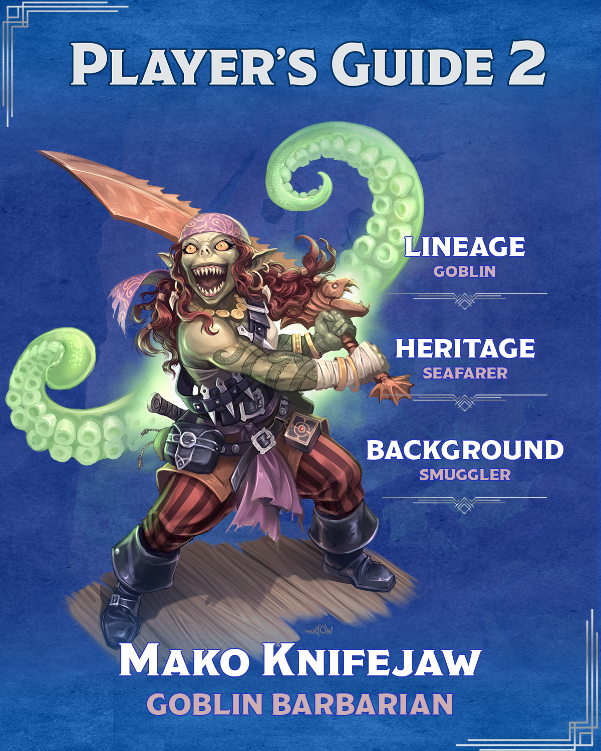 Mako Knifejaw has the magic of the ocean flowing through her veins. Born to a clan of seafaring goblins who sail aboard huge dwelling-ships, Mako loves the water and everything about it. She also draws eldritch energy from the ocean’s ceaseless forces, which grant her ferocious power in combat.
