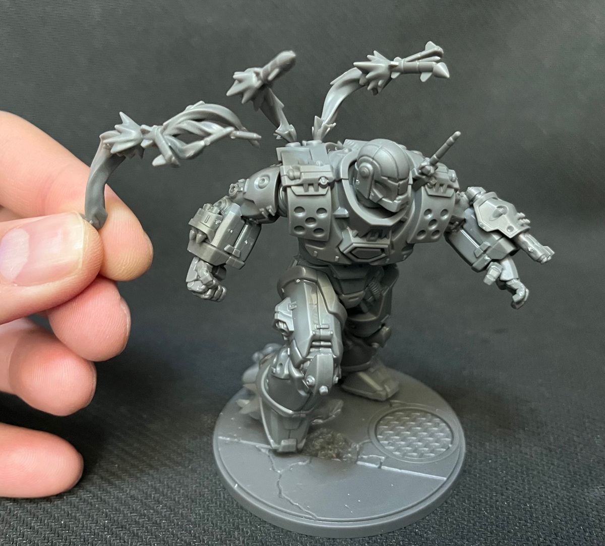 Those bits have a peg at the very bottom of the smoke trail and I get the feeling you’re supposed to glue them into his back. But I also think those can be glue however you think looks the coolest. If you’re one of those people with a bunch of tiny magnets you could even magnetize them all. I’m not that good with magnets so I probably not going to do go that route. I am, however, keeping these around. I want to use some sticky tac so attach them on turns when I use Iron Monger’s Shock and Awe Team Tactic Card. I think that will look awesome.