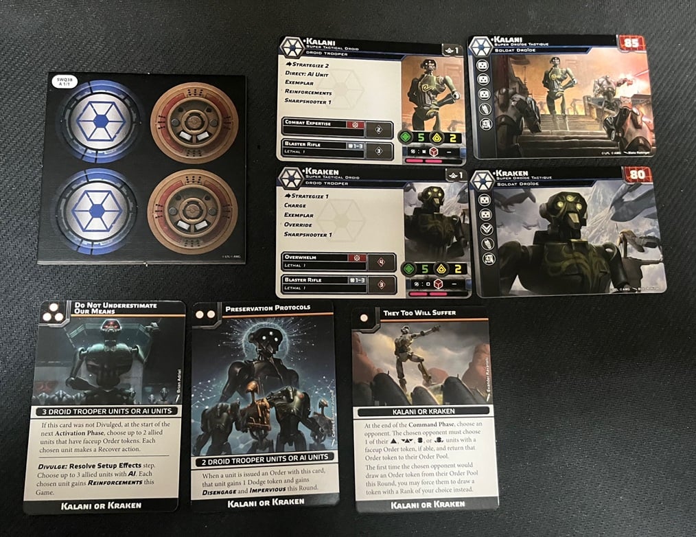 As far as the cards go you get a play set for each supported language. Above I used the English cards and then the French cards to show off the back of the respective droids. You get one card for Kraken and one for Kalani. And of course you also get the Command Cards, too.