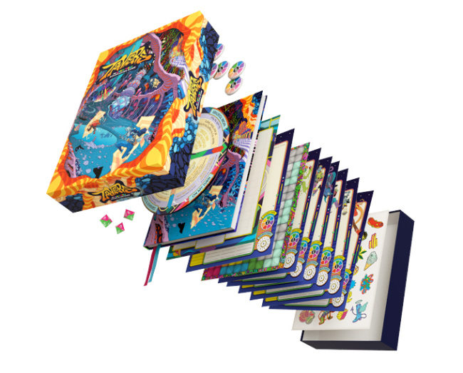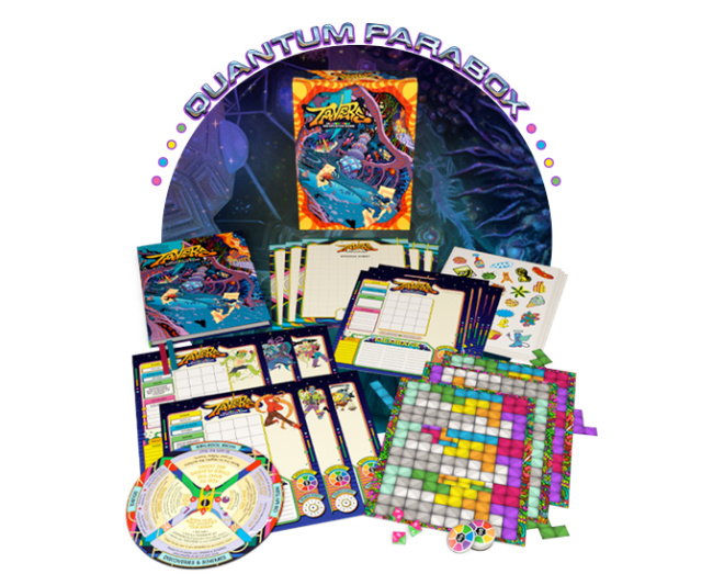 The core set, or Quantum Parabox, comes with everything needed to play, including the 150-page full-color rulebook, three eight-sided dice, five blank and eight pregenerated character sheets, “Psych-O-Dynamic” reference wheel, game tokens, inventory sheets, and art stickers. MSRP is $75.00. The core rulebook will also be available separately at $50.00 MSRP.