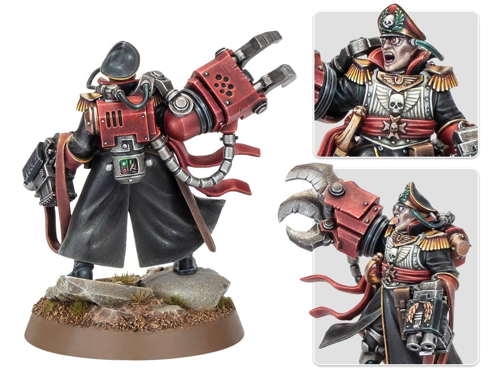 Commissar Sebastian Yarrick returns to Armageddon with a cool new miniature that pays tribute to the Yarrick models of the past. The Hero of Hades still sports the iconic pose, raising his pilfered Ork power klaw high and shouting defiance at his foes. You’ll notice the blazing bionic eye, billowing sash, shoulder epaulettes, and distinctive hat have all carried through from earlier versions of the miniature.