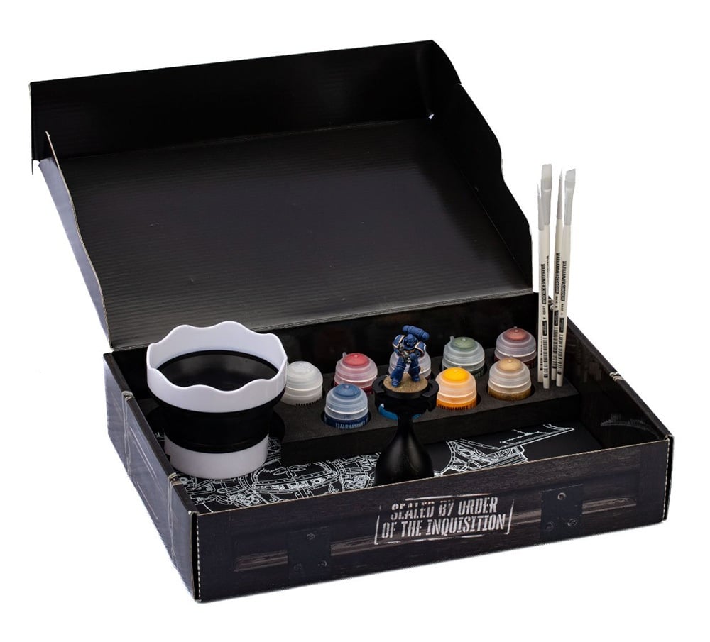 The box even converts into a painting station, with a slot for both the premium set’s paint cup and the Warhammer water pot (miniature, brushes, paints, and painting handle for illustrative purposes only).