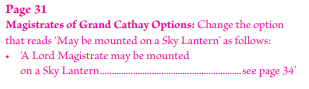 This is likely the biggest change in the FAQ. Effectively this removes the option for the Strategist to take the Sky Lantern as a mount. The effect of this is to remove the cheaper character option for taking a Sky Lantern. In addition since Magistrates are 0-1 per 1000 pts and share that slot with Shugengan Lords, Gate Masters and Supreme Astromancers its now a real choice to take a Lantern in Characters. It also means that even if you aren’t playing with any special comp outside of the Match Play Guide, you can’t take more than 5 Lanterns, where before 7-8 was technically possible.