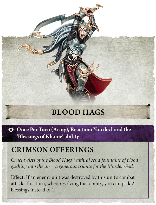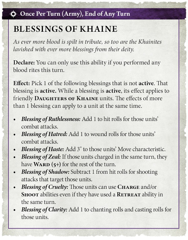 So what does the Blood Rites rule actually trigger? Well, Blessings of Khaine, of course! Because Khaine loves a good blood bath. And these abilities will certainly help the DoK spill even more blood. It’s almost like this blood god doesn’t really care where the blood is flowing from as long as it’s flowing…